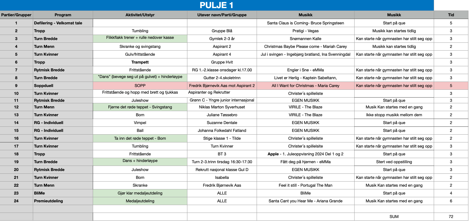 Da begynner vi å bli klare 🎅 Som dere ser, er det tett program…🎄 Det vil si at alle må stå klare til sin øvelse når øvelsen før din er i gang. Klarer vi det, kan vi klare å holde én oppvisning på ca 1 time.